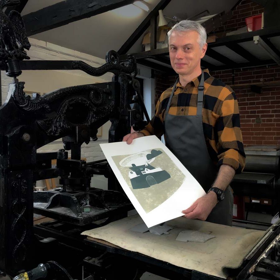 Andrew Sharman is a printmaker and designer based in North East Essex. After a career in graphic design, he was inspired to begin his printmaking journey after attending a short course at Gainsborough House in Suffolk. Here, he discovered the true potential of relief printmaking using lino and materials such as MDF.