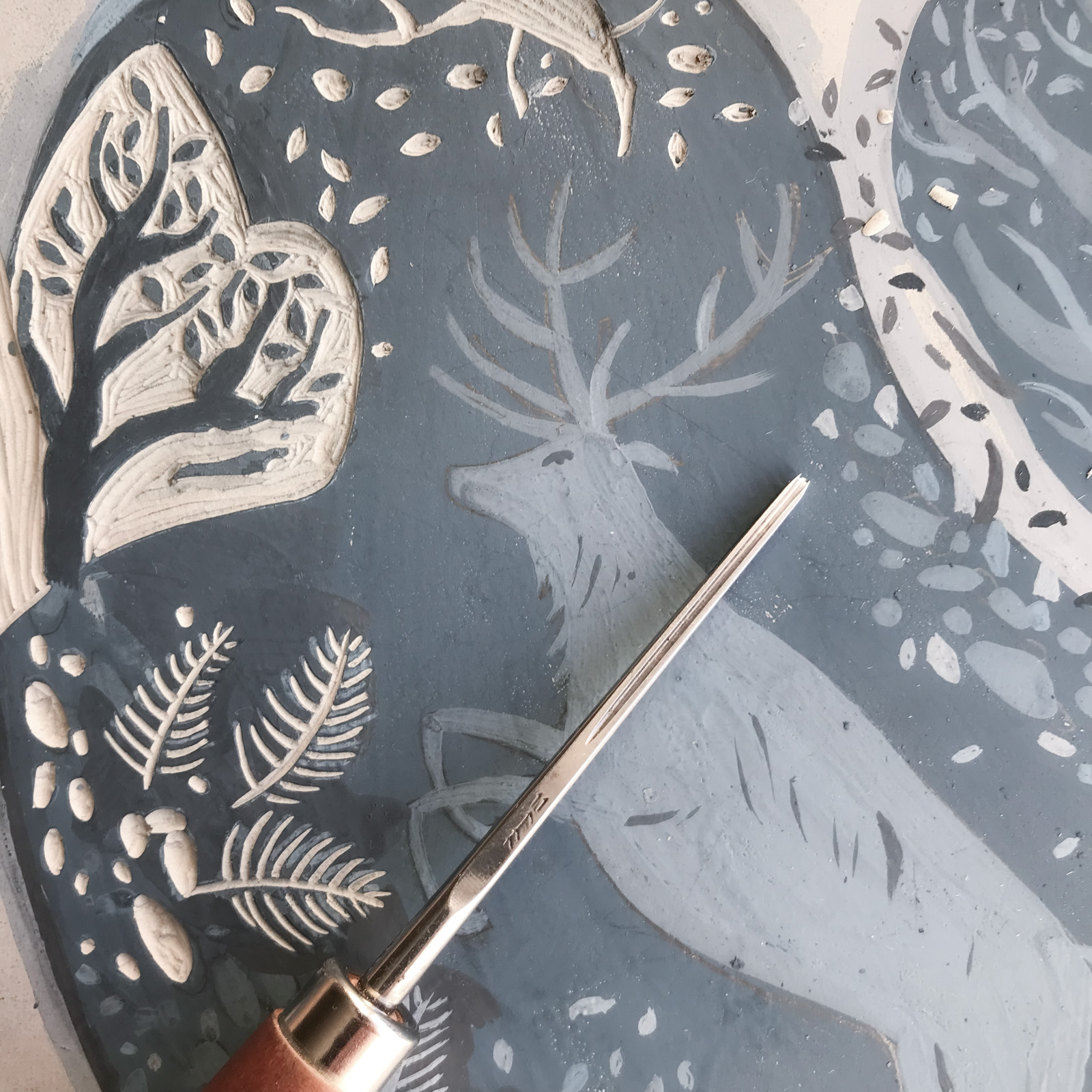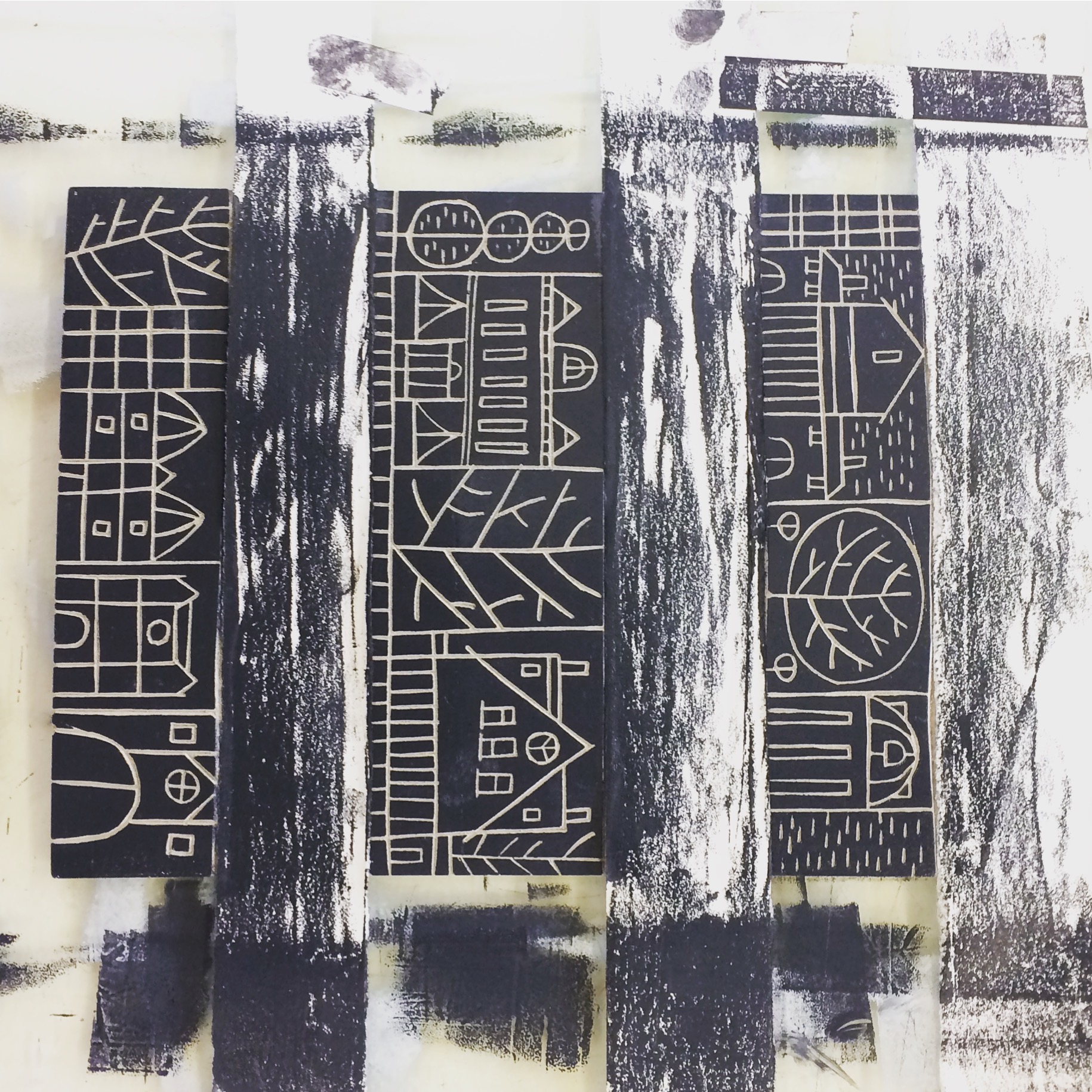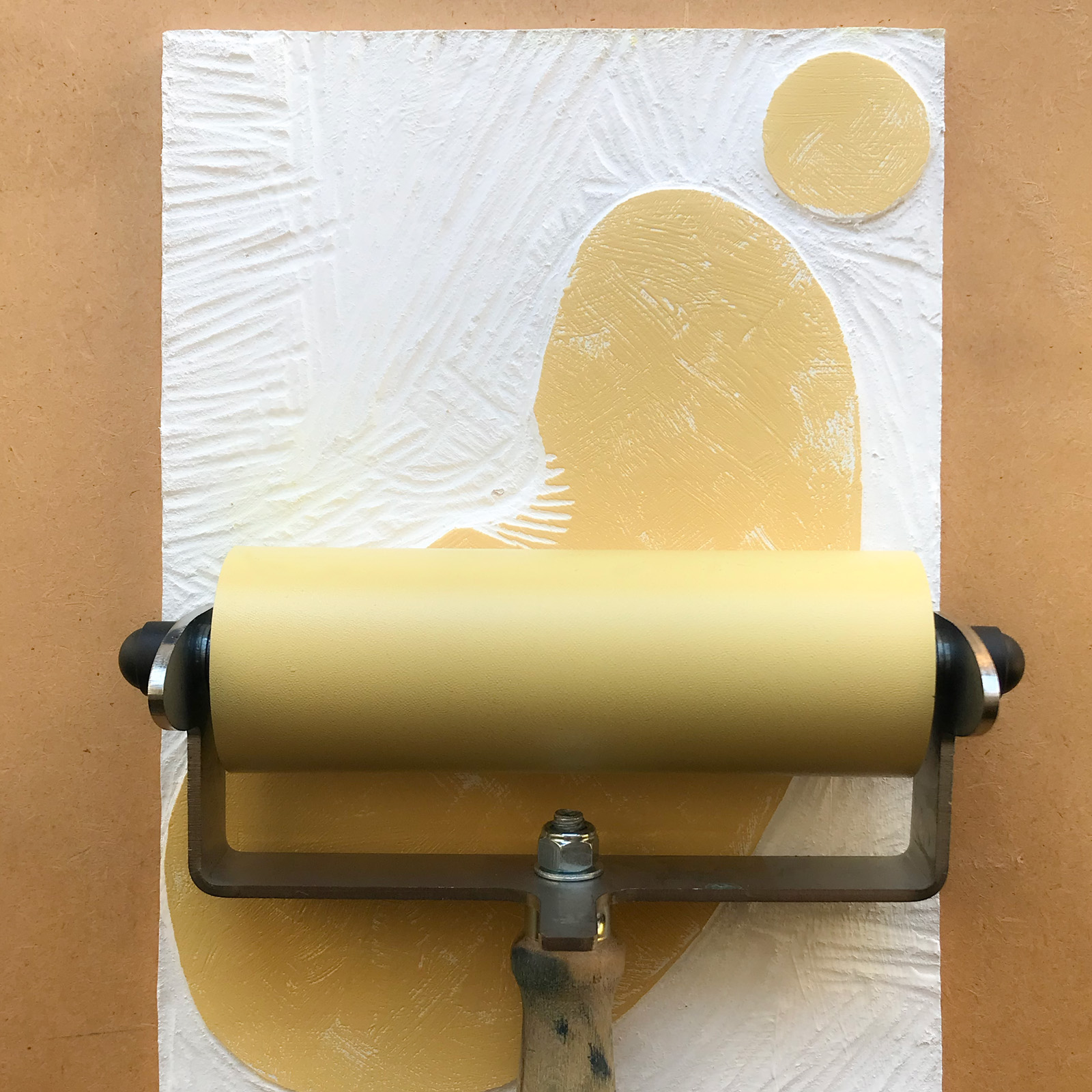 “My primary interest is the combination of shape, texture, and colour that printmaking can provide. My work starts with a composition idea that evolves to incorporate mark-making and texture. I often paint onto lino blocks to create free and organic shapes, which I carefully cut around with carving tools. I also use MDF blocks to produce rough shapes and textures combined with lino blocks to create the finished work.